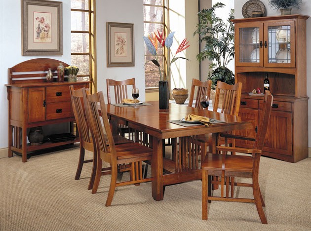 Medium brown finish with solid oak and veneer mission style dinning table. Table can be extended with a center piece. Matching chairs and server.